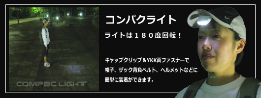 キャップクリップ&YKK面ファスナーで帽子、ザック背負ベルト、胸ポケット、各種ヘルメットなどに装着でき、ライトの向きは180度動かせる。